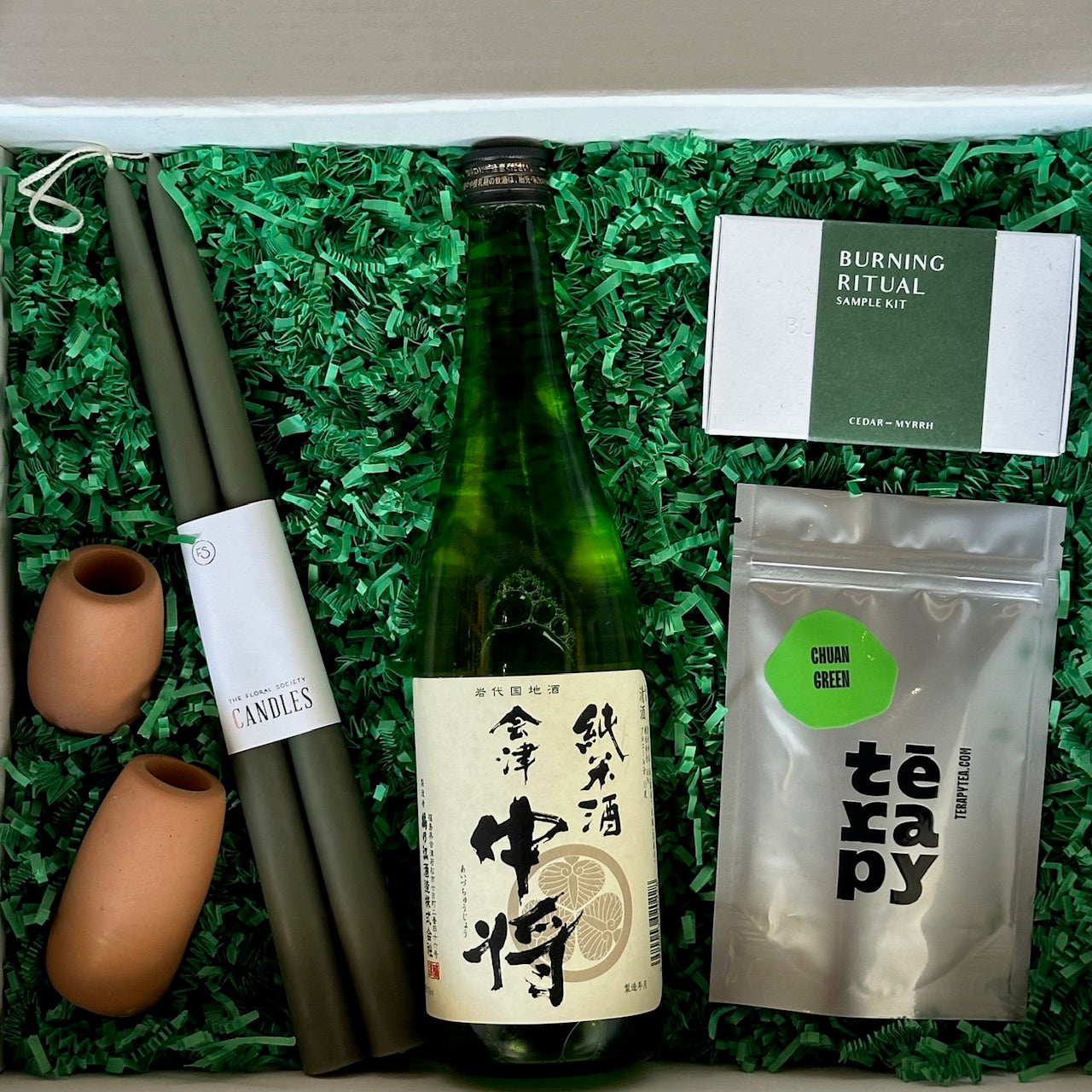 Aizu Chuko Junmai sake, Whiskey+Wine Candle holders set, Floral Society taper candle, Terapy chuan green tea, Cedar & Myrth Burning Ritual kit in a Blüm branded box