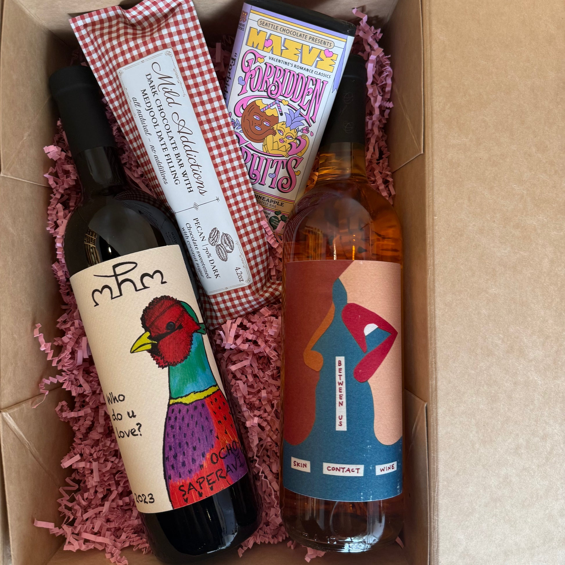 Ocho Saperavi Who do you love? 2023, Borgo Savaian Between Us Skin-contact, Mild Addictions "Pecan", Maeve Chocolates
