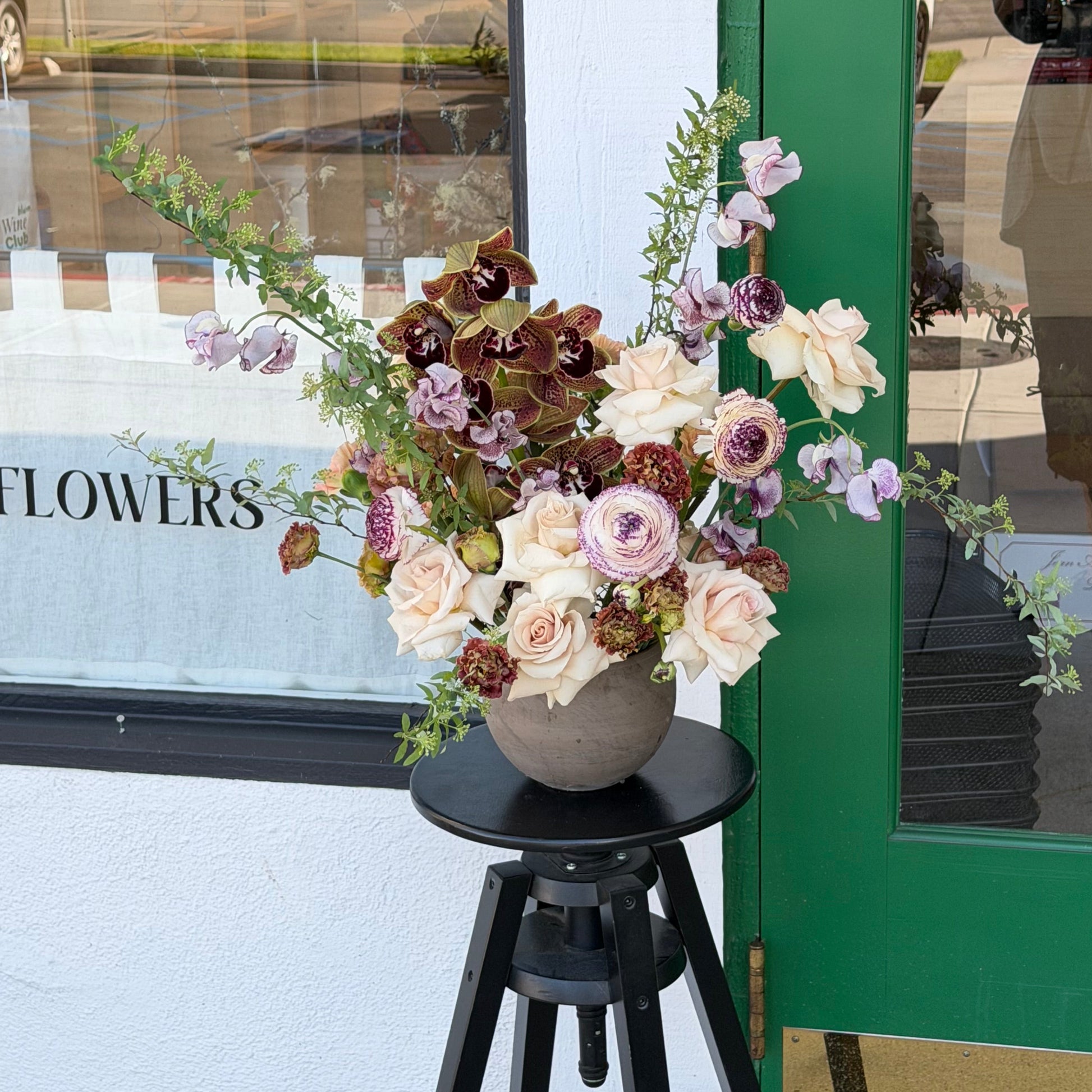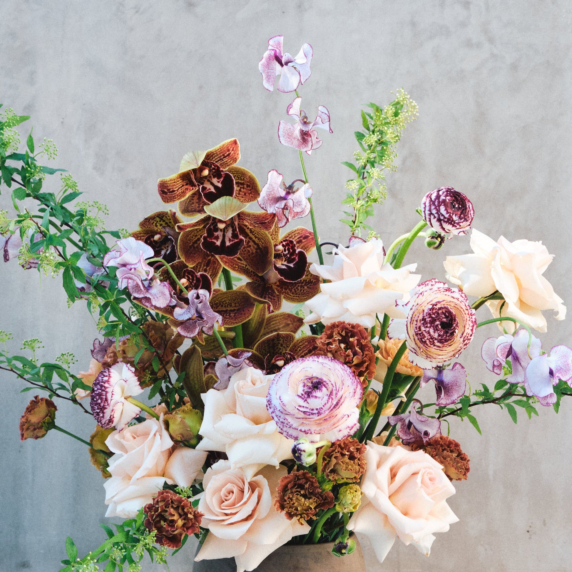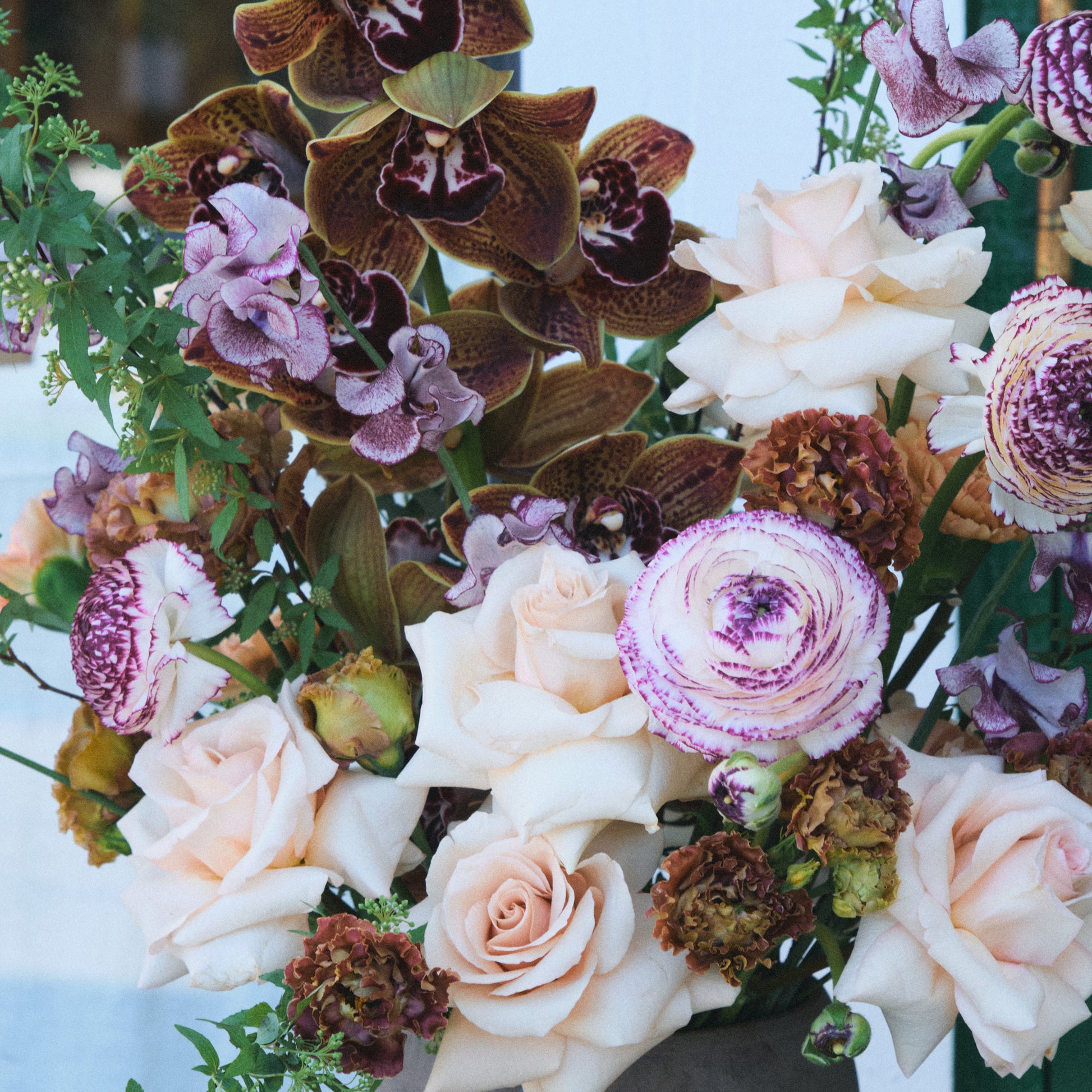 Velvety cymbidium orchids, soft quick sand roses, japanese spirea and patterned ranunculus unfold in a sculptural, garden-loose composition—rich, intimate, and unmistakably elegant.