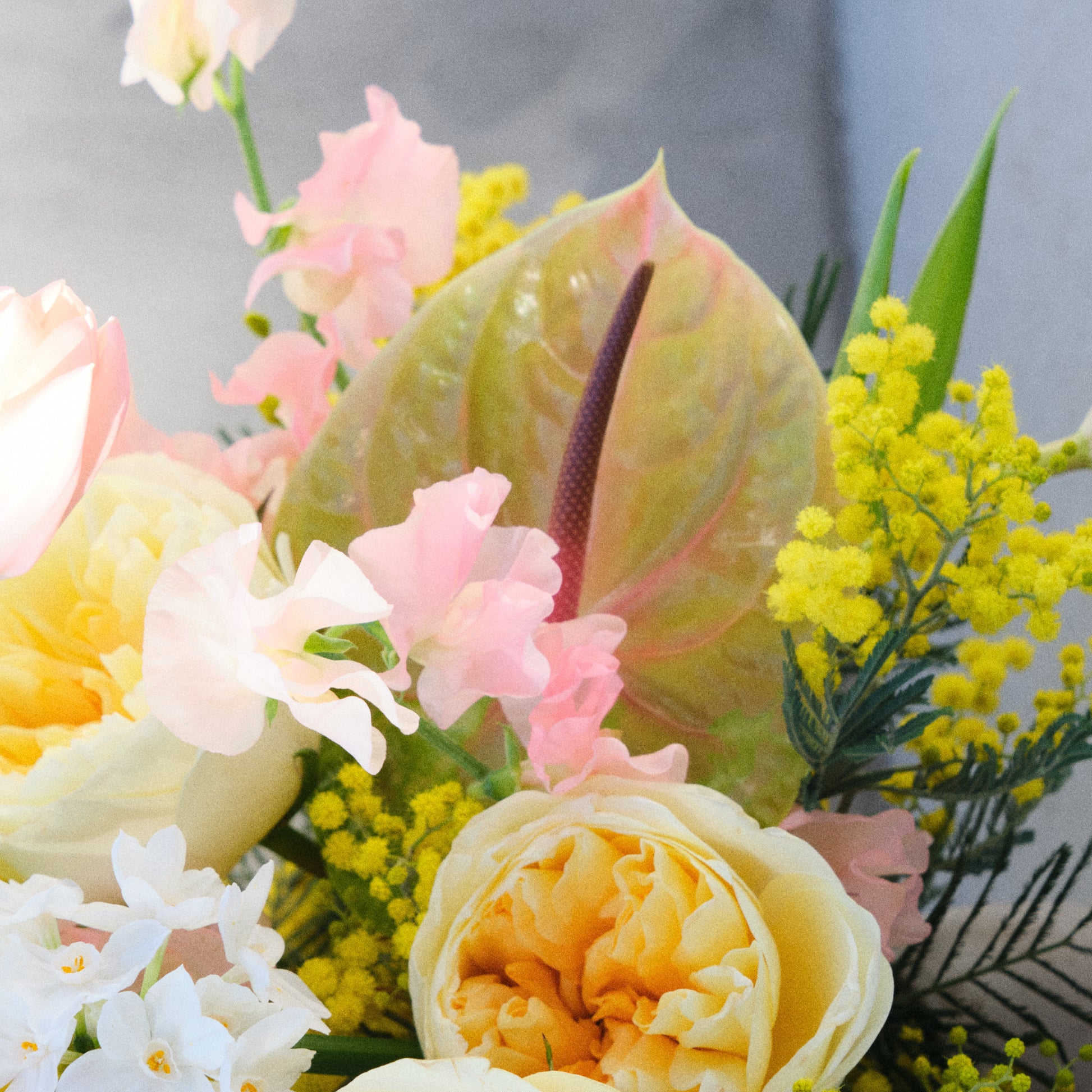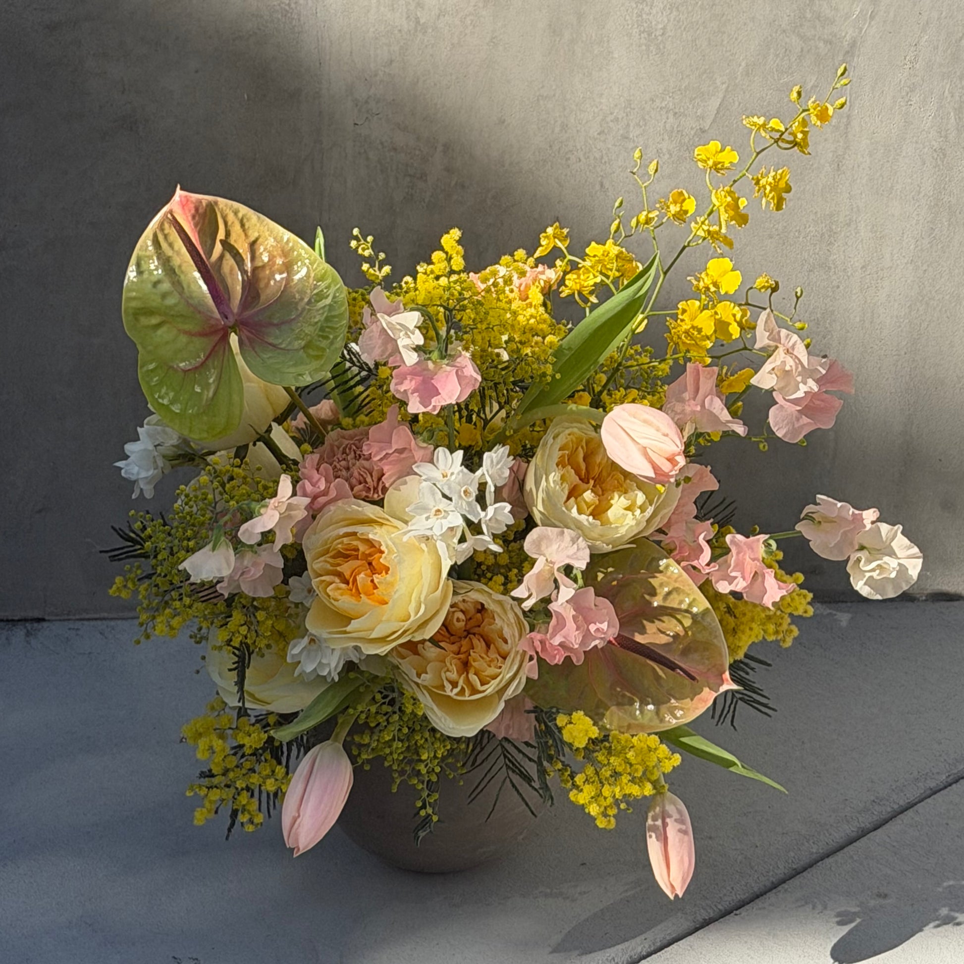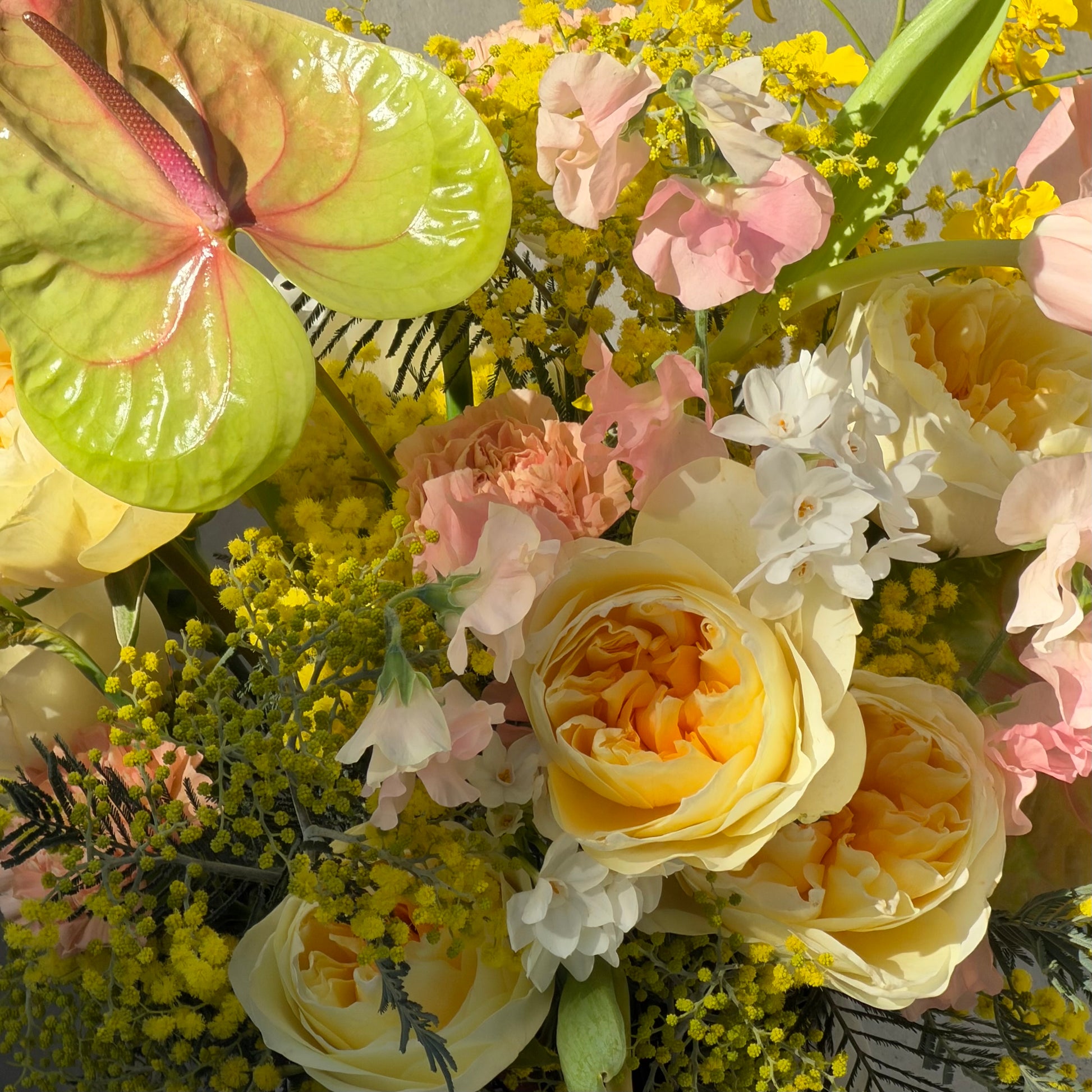 Buttery garden roses, blush sweet peas, golden mimosa, and soft anthurium come together in sunny arrangement — nostalgic, poetic, and full of heart.