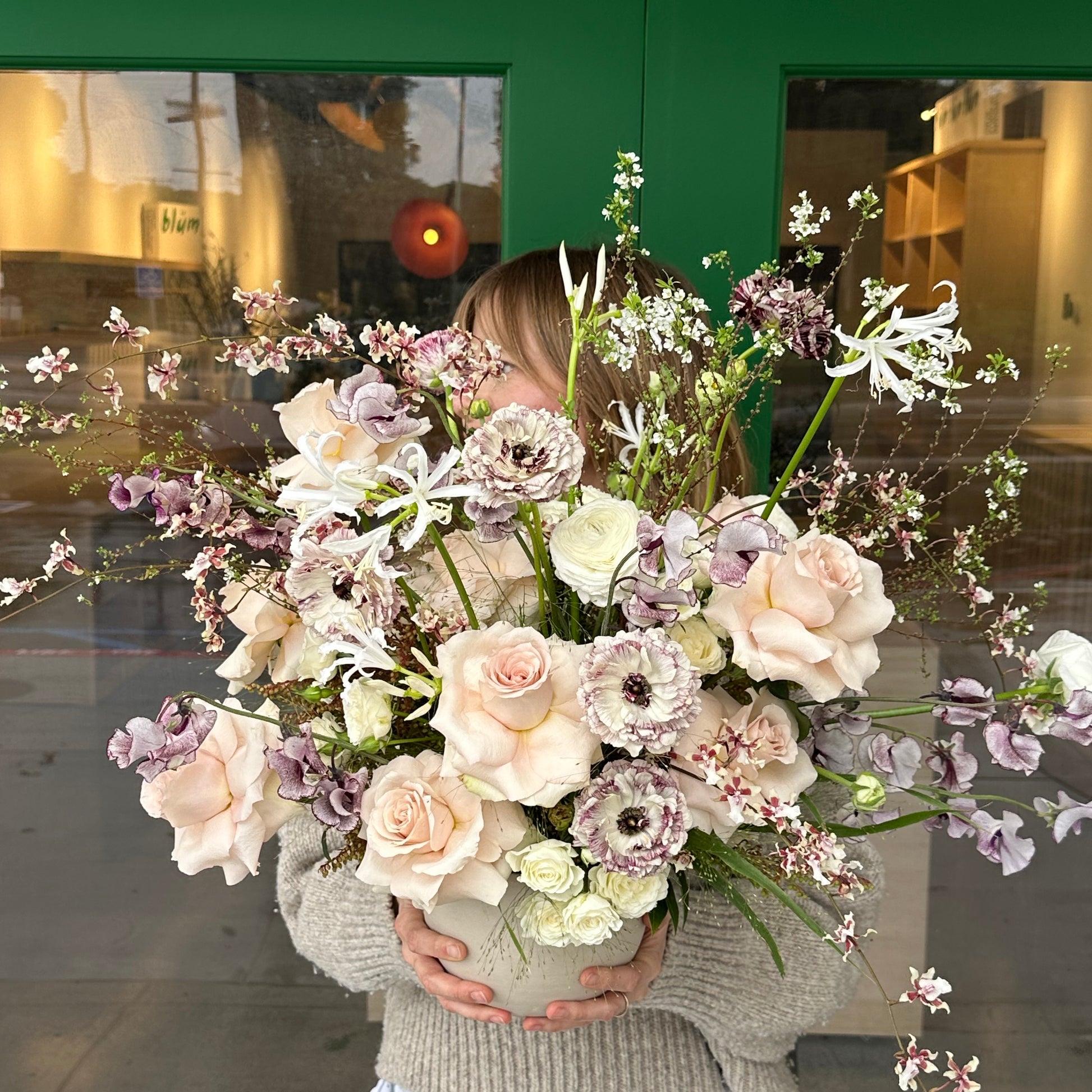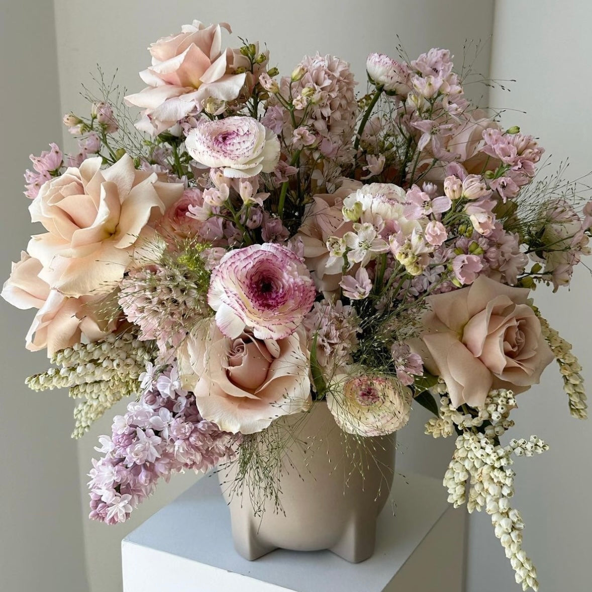 Light and gentle, with blush quicksand roses, ranunculuses, hyacinthus, panicum. Some flowers might be different from the photo, depending on availability