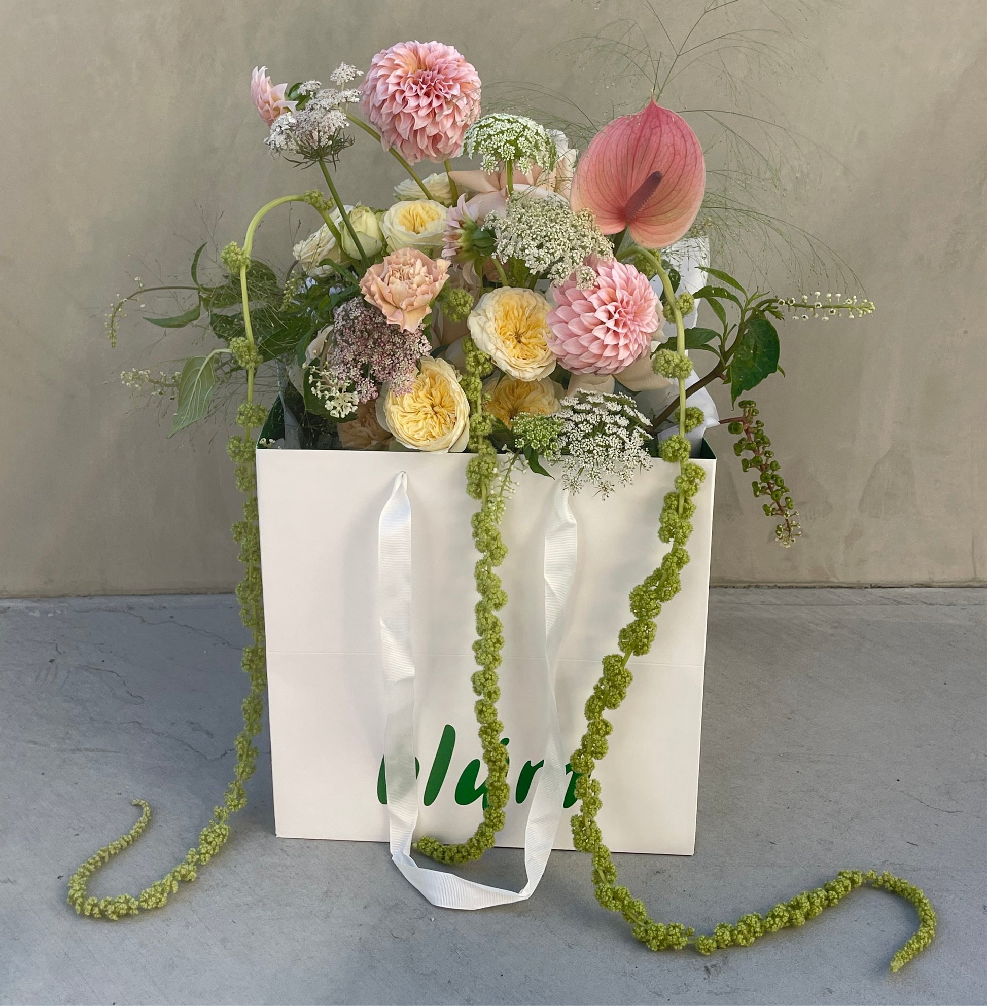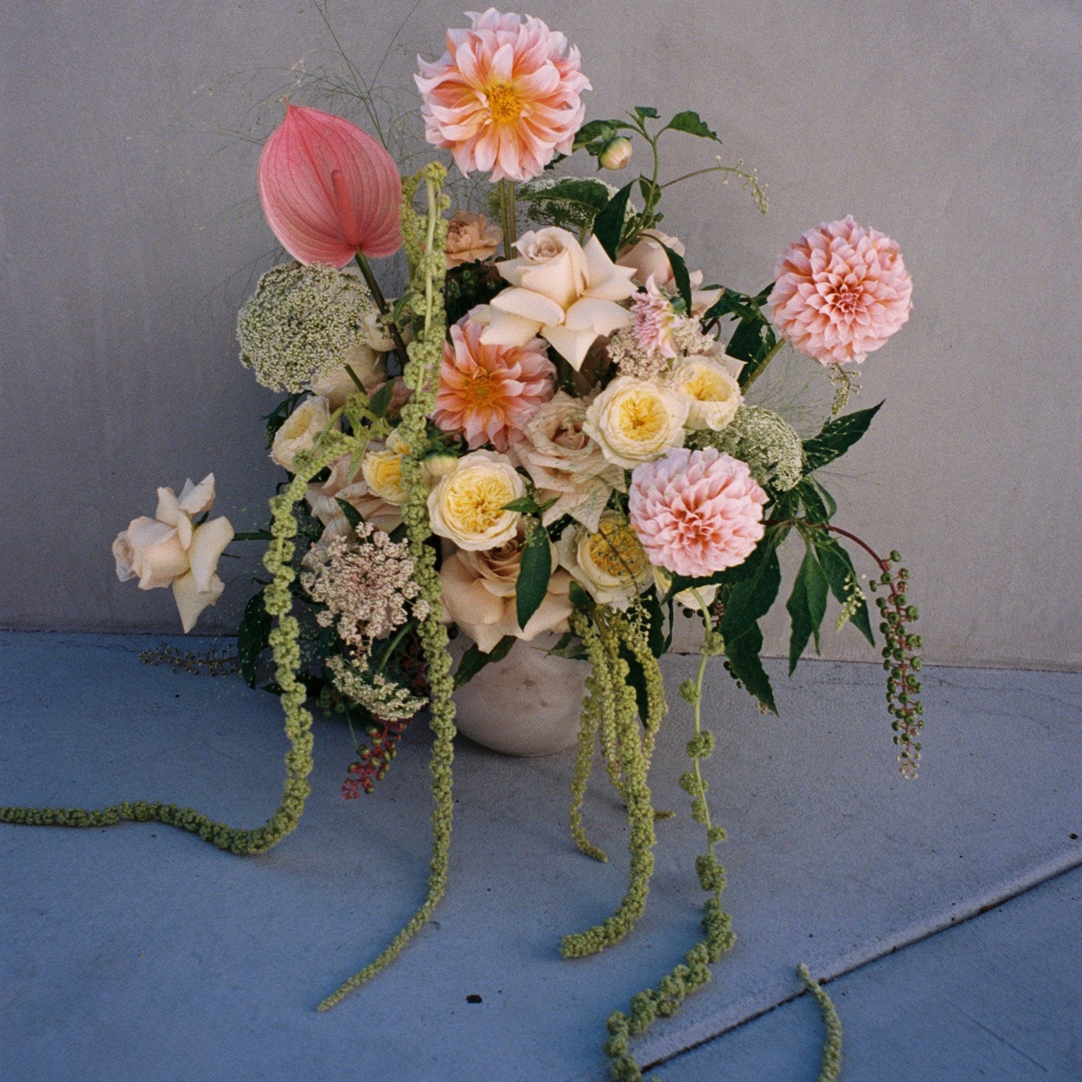 This garden-inspired arrangement captures the feeling of a sunlit summer meadow brought indoors. Soft quicksand roses, golden garden roses, delicate dahlias, and airy queen anne’s lace mingle with playful grasses and trailing green amaranthus. Accents of citrus-yellow blooms and striking textural elements add vibrancy and depth, while cascading greenery creates a dramatic, sculptural flow.