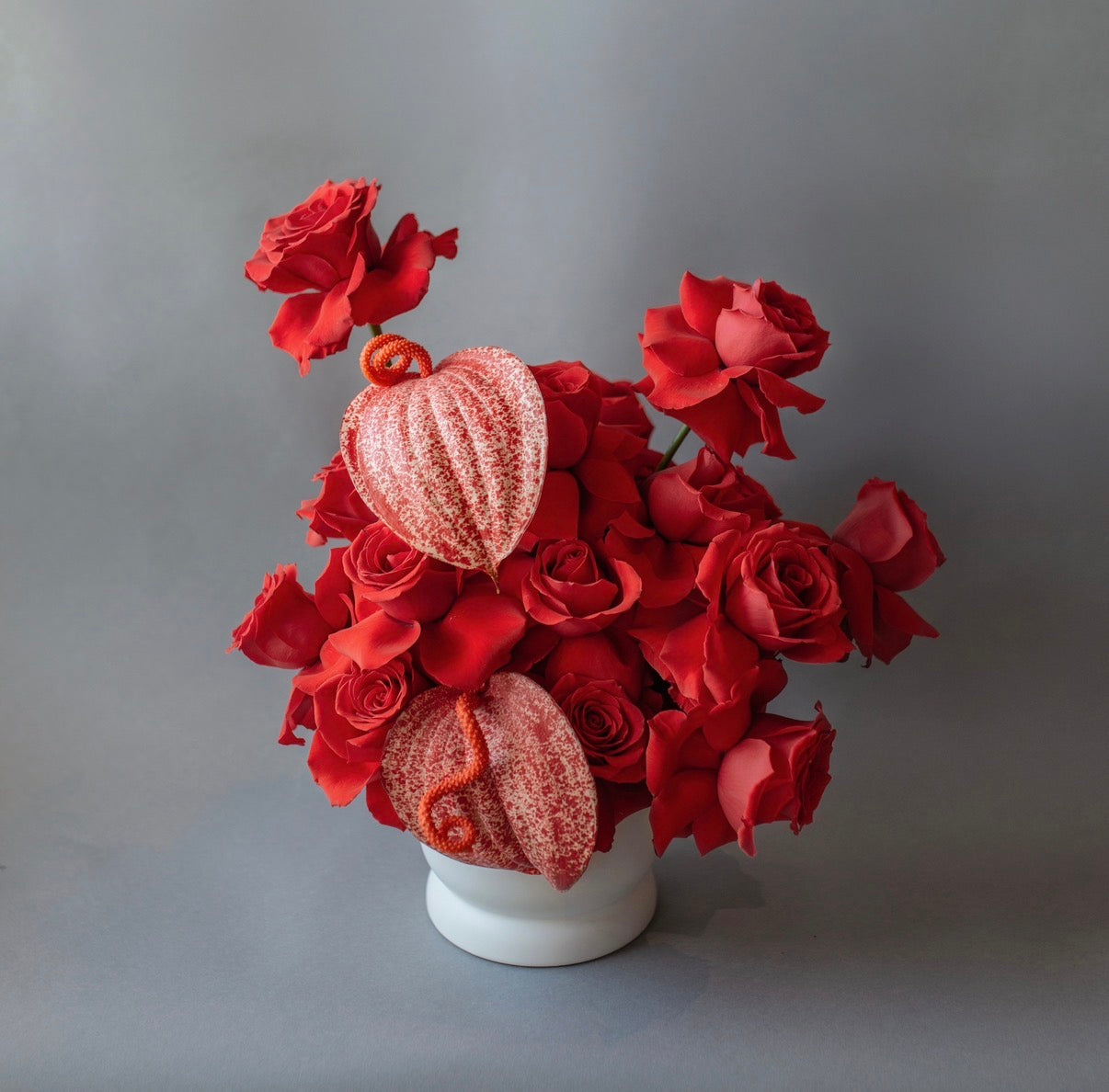 Velvety Nina roses spill generously around sculptural heart-shaped anthuriums, creating a bold, unapologetic composition that feels both indulgent and intimate.
