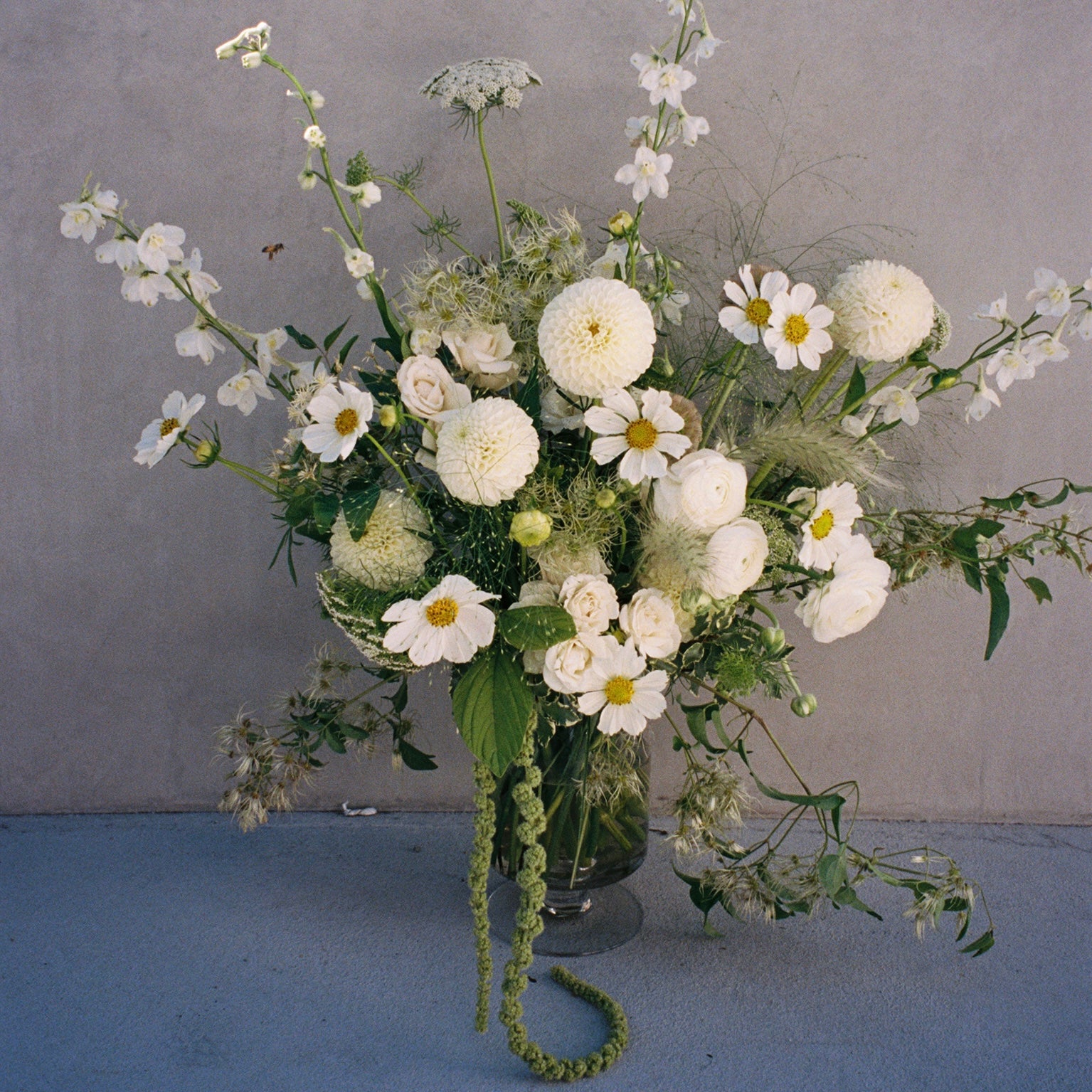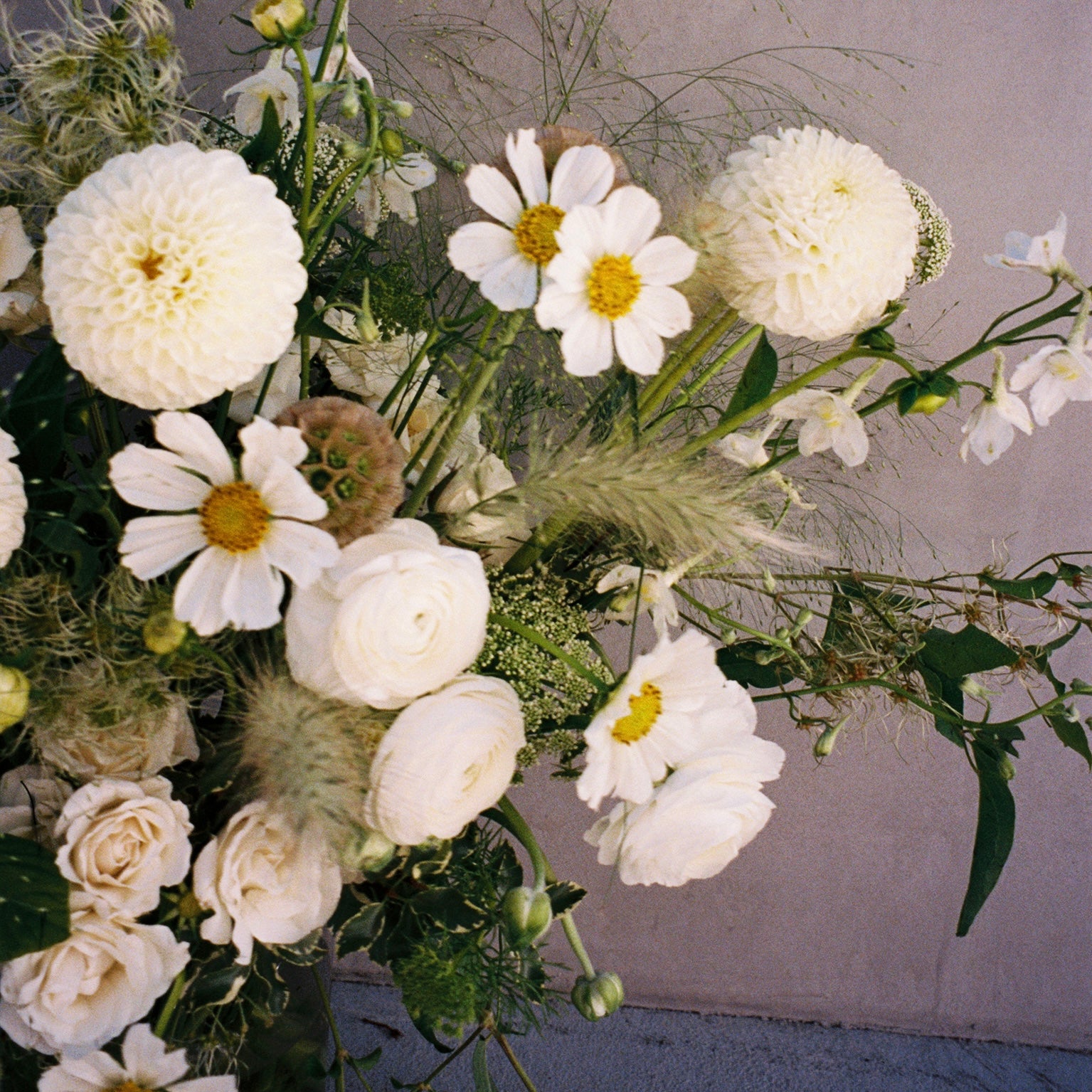 An airy, ethereal composition that celebrates the quiet beauty of a wild meadow in bloom. Creamy white dahlias, delicate ranunculus, garden roses, and fluttering cosmos are paired with whimsical grasses, queen anne’s lace, and textural seed pods. Cascading amaranthus adds movement and depth, while the overall palette of fresh whites and greens creates a serene, timeless elegance.