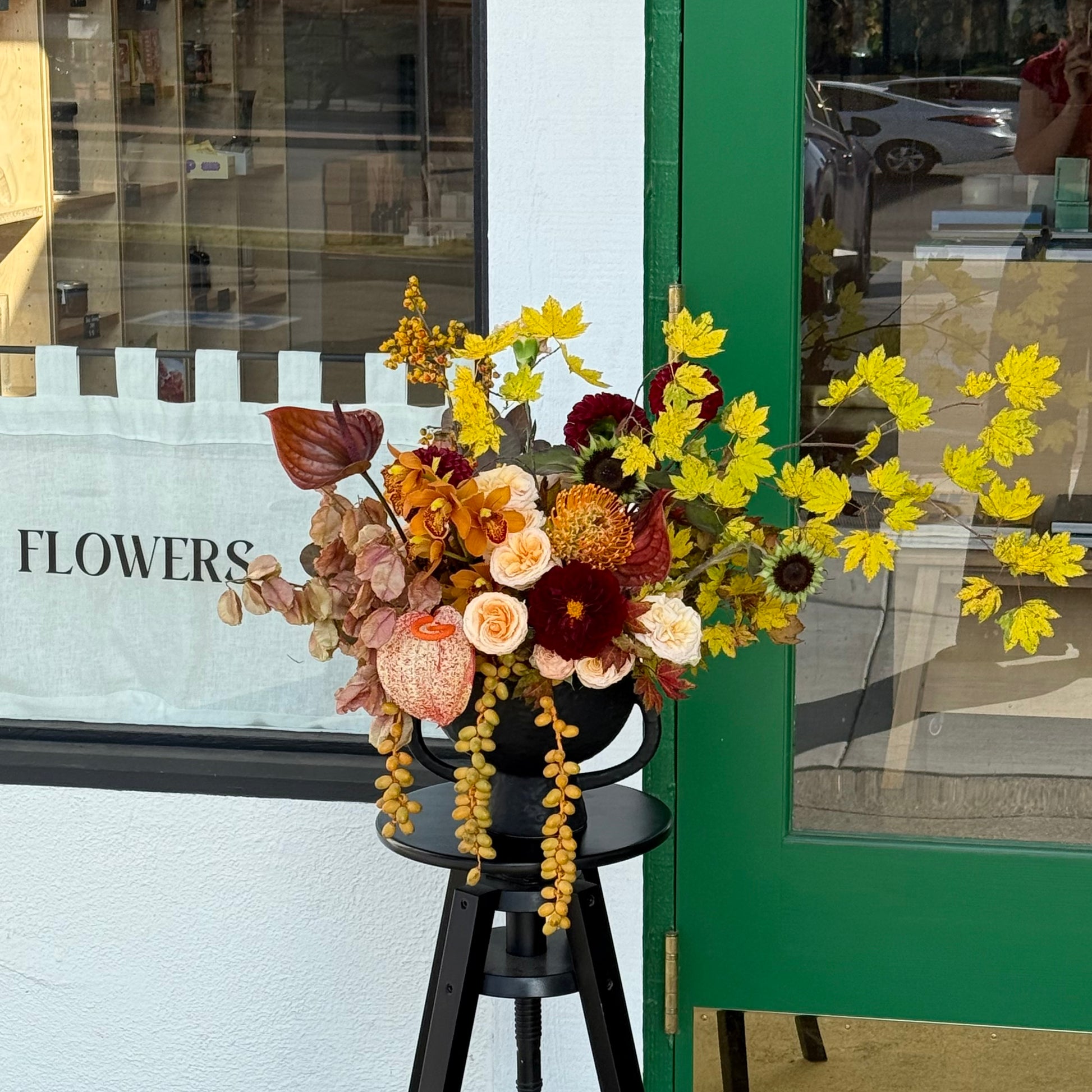 Like a walk through an autumn garden at golden hour, this arrangement brings together creamy garden roses, peachy ranunculus, ruffled maroon dahlias and anthuriums alongside textural treasures like berry sprigs, airy grasses, and velvety celosia. Soft blushes and apricots are anchored by deep wine tones, with hints of citrusy orange for brightness. Designed in a neutral vessel, it carries the warmth and richness of fall into any space.
